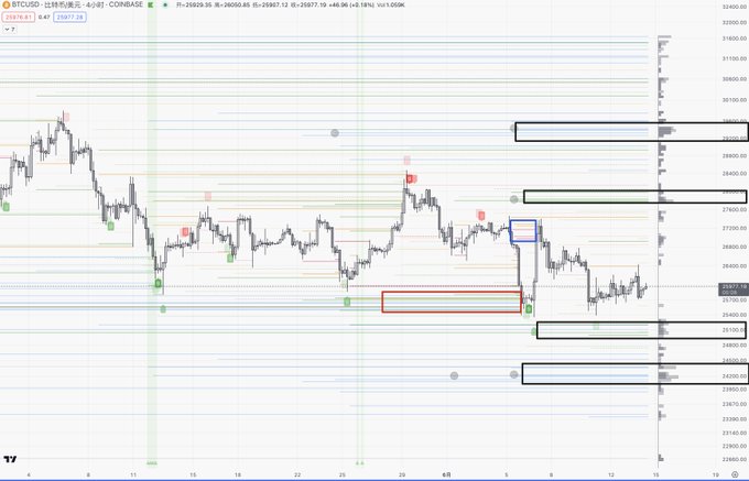 #BTC 很久以前我就提到的密集清算位25500附近(红框)前段时间终于清算掉了,并且没过一会儿就上去打了追空人的止损(蓝框) 黑框标注了目前