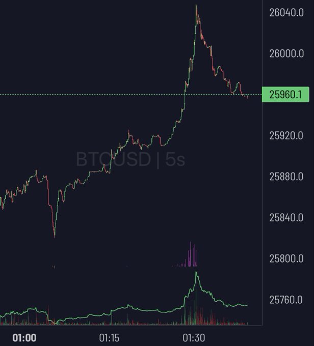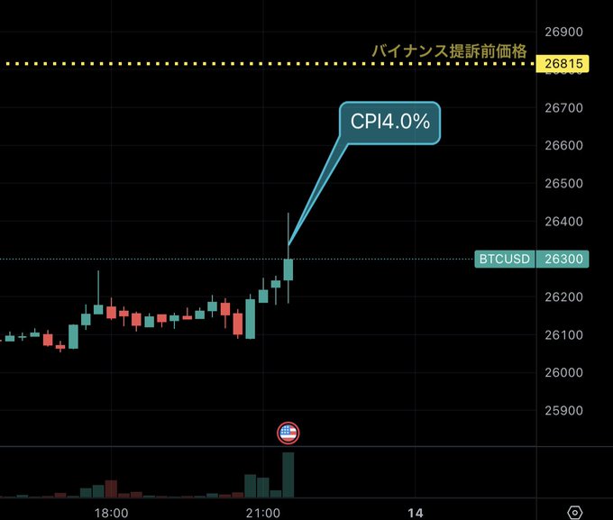 BTC速報:注目のCPIは予想4.1%に対して4.0%を記録し、ビットコイン価格は一時26400ドルを回復 #ビットコイン