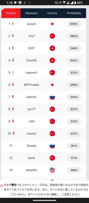 #BTC $COT #FX #投資 FX下手になった気がしたので奮い立たせるべく 6月1日から開催されてるFX大会に5日前から遅れて参加中。。 とりあえず首位まで到達 だが中華軍団にすぐ抜かれる むこう絶対組んでるだろwmw 団体vs1人は最終日にめちゃ不利だなぁー