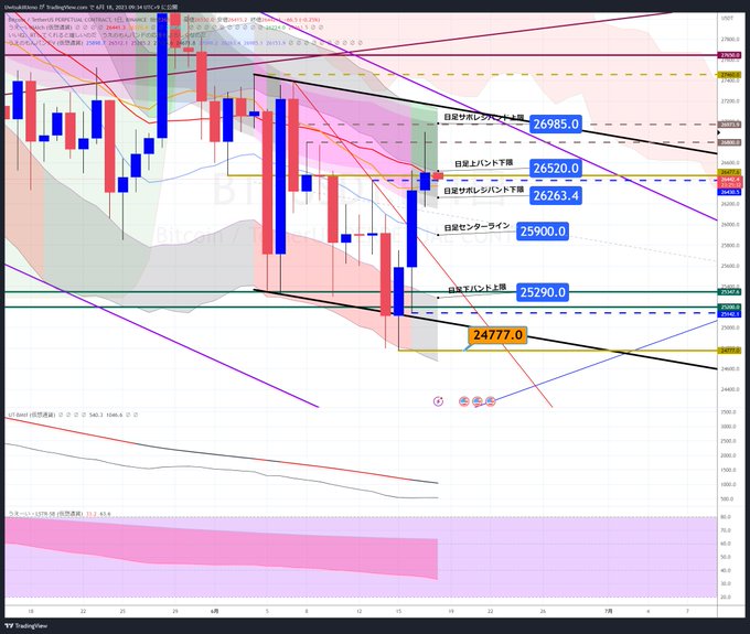 #BTC ビットコイン uubnsk 6/18 引続き短期的には上昇気配が続いていますが、上は抵抗要素抑え続けており、転換に至るかどうかまでは分からない、と言う環境なのだ 26520~26985程度は上値余地兼、抵抗見込み 下は26260辺りをブレイクしない限りは(日足レベルでは)様子見なのだ