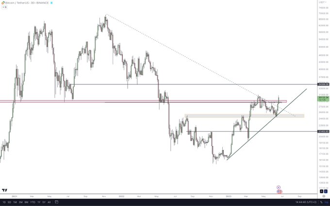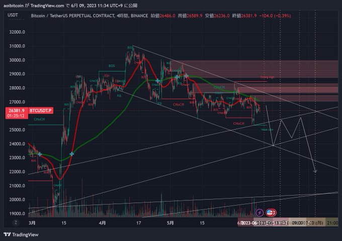 $BTC 意見変更なく今月は相場は下 今週はまだ落ちるイメージはなく 再度上へ振ってから来週明けに重要ラインを割って来ると見ています その後反発して、月末頃に続落していく 今月は大陰線の可能性を感じています #BTC
