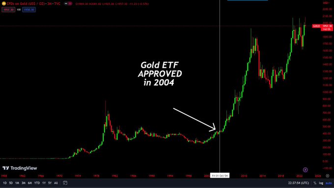 先日、Blackrock、WisdomTree、Invesco、Valkyrie、Bitwiseが #Bitcoin 現物ETFを申請しました。 もし承認されたらどうなるでしょう? 過去を振り返ると、2004年に金ETF
