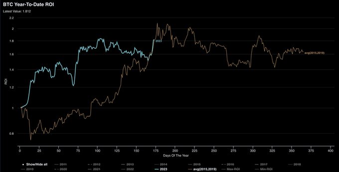 #BTC 2023 YTD ROI compared to a time-averaged YTD ROI