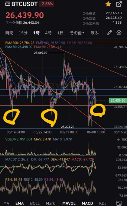 #BTC #Bitcoin 写真の🟡がサポートになっていると判断しました😎 ひげはストップ狩りと #Binance
