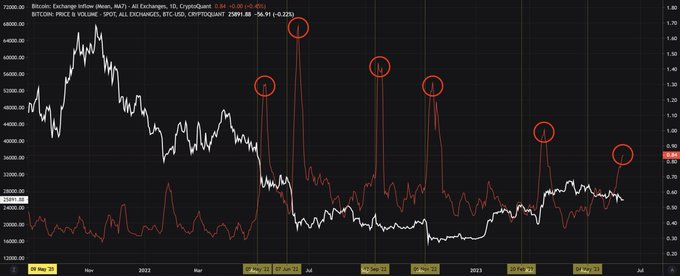 【速報】ビットコイン、暴落の兆し📉📉📉 過去にビットコインの暴落が起きる前には「Inflow mean(流入平均値)