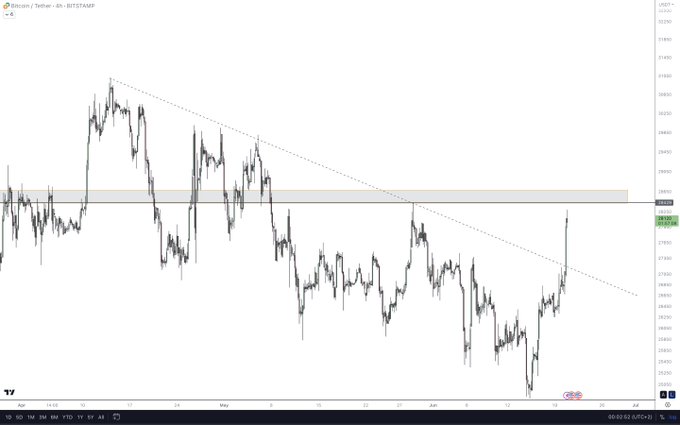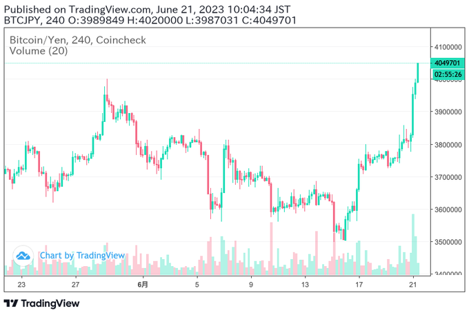 【価格アラート】 ビットコイン(BTC)が続伸し、日本円建て400万円台(28,500ドル)を回復した。 円建の年初来高値は4月11日の4