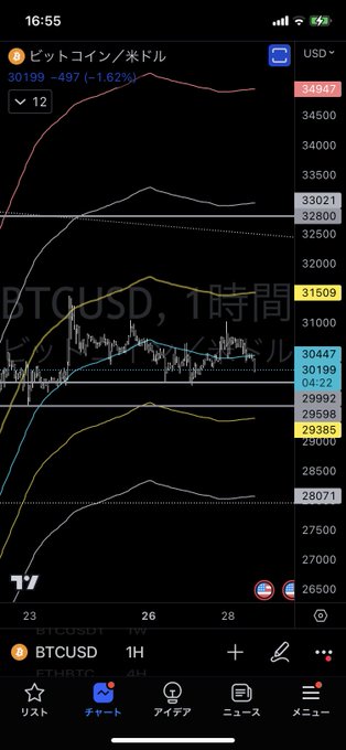 単なるレンジです。 仮に深掘っても下部の黄色のバンドを下回る可能性はかなり低いです。 #BTC https://t