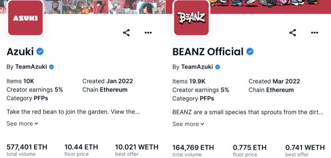 Azuki down from 17 eth Beanz down from 1.3 eth https://t