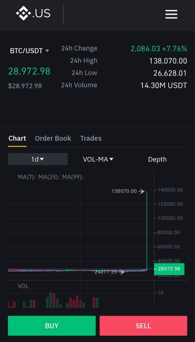 Le prix de la paire BTC/USDT sur BinanceUS a brièvement
