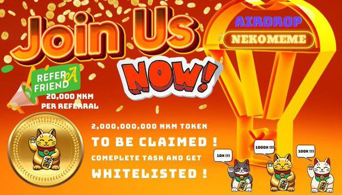 New airdrop: NekoMeme (NKM) Reward: 100,000 NKM (~$10) Rate: