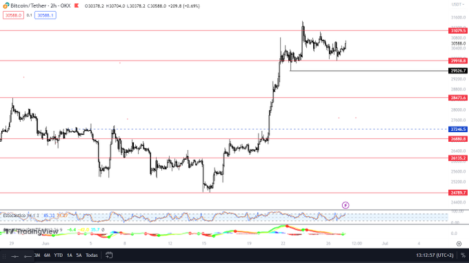 rendy分析 【BTC/USD】ビットコイン/ドル 1時間足 30633.56抵抗で反発、ダブルトップ形成。 やはり一旦下落と見ています。 ショートの目線変えて 30274
