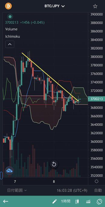 #BTC 短期1時間足 「ここ抜けたら上だよね」のラインを規定してわずかに上抜けか? そろそろ上げてこないと売っちゃうぞ笑 頑張れ✨🥰