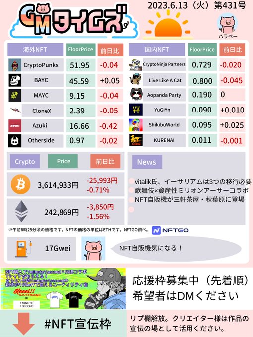 / gmです〜☀️ \ GMタイムズ 第431号。今朝のNFTフロアプライス、BTC・ETHの価格、GAS代、Web3ニュースをまとめました。 昨日の国内取引量No