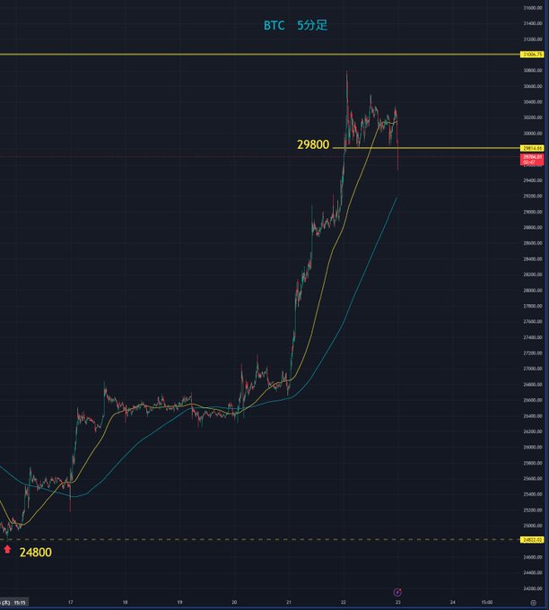 BTC29800のラインを割れる(´・ω・`) しばらく調整のターンかなぁ じっくり押し目を待ちましょう 買い遅れた人にはまたチャンスが来ます #BTC