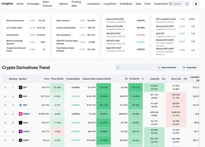 アルトコインのデリバティブトレードする時のおすすめサイトがCoinglass(https://t.co/tfSL0ENWBT) 通貨をスクリーニングする時にトップページの「Crypto