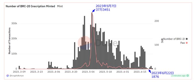BRC-20トークンの発行数が減少しています。 5日連続で3万以下 BRC-20は、ビットコインのブロックチェーン上に独自トークンを発行できる規格で、今年5月に沢山のミームコインやNFTが発行されて話題になりました。 #BTC