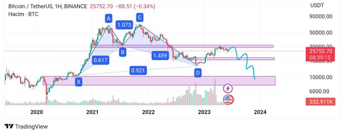 rendy分析 【BTC/USD】ビットコイン/ドル 1時間足 高値切り下げながら下落し、26119