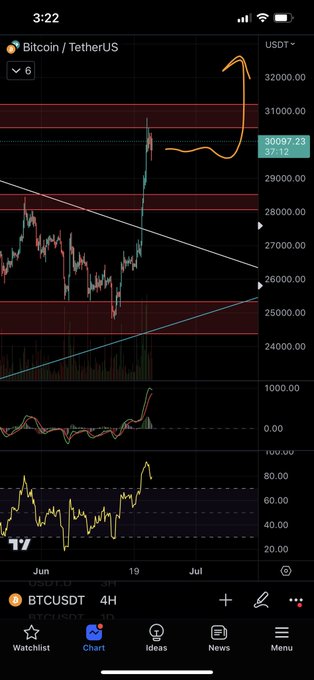 rendy分析 【BTC/USD】ビットコイン/ドル 4→1時間足 29056.39抵抗まで上昇後反発。 勢いが弱まったので一度下落を挟んでくると見ています。 28667