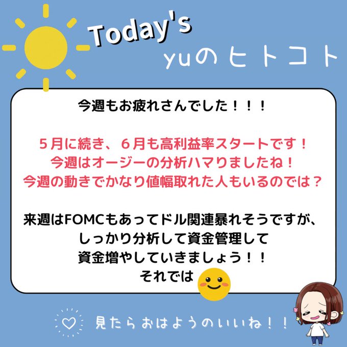 \ おっはようございます🥰 / 今週もお疲れさま😳 6月は天気も崩れて テンション下がりそうですが、 いつものごとく期待値積み上げて トレードしていきましょう🥰!! ご挨拶のいいねと リプお待ちしてます🥰 #投資