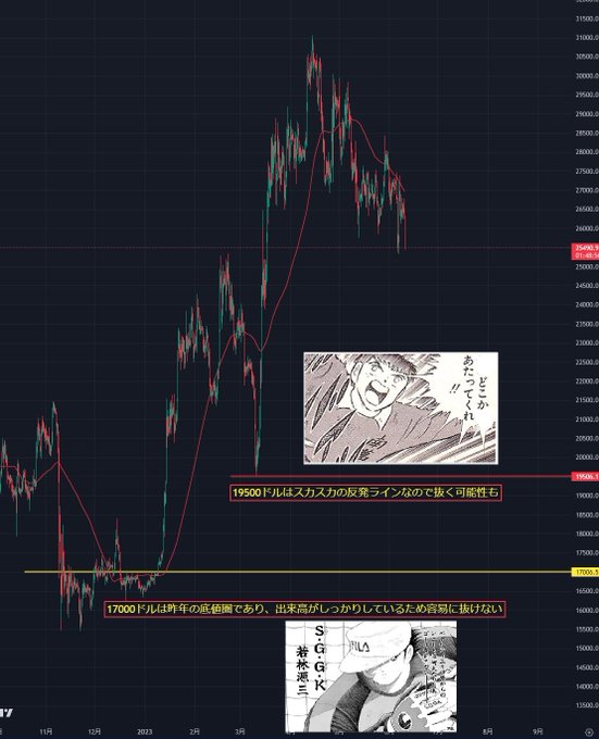 BTCの流れは下落トレンドのため、下手にリバ狙いのロングとか狙わずにショート放置のまま、正直何もせずに待つのが良いのです(´・ω・`) もしも暴落した場合の下値目処になります 19500-20000ドルを割り込むかどうかになりますね 非常に出来高が乏しく抵抗線としては弱いです…