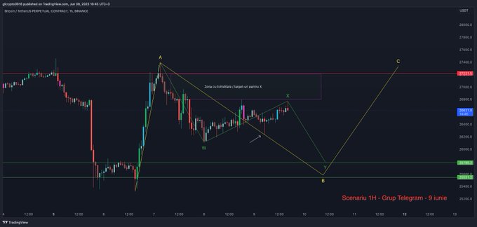 BTC 1H. Pe timeframe mic, acel ABC este singurul scenariu