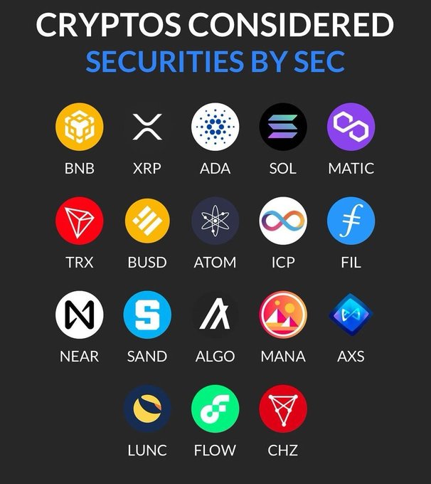 #仮想通貨 SECが『未登録証券』と指摘してる銘柄です 今はリスク回避で売られやすいです。 逆に、分散化してるビットコインやDeFi関連銘柄などが買われています。