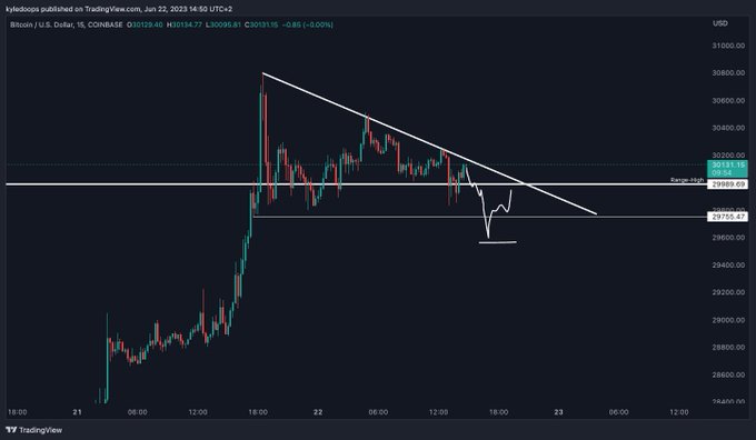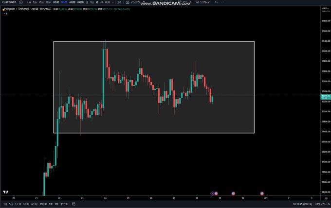 ✅#ビットコイン (BTCUSD)環境認識 ビットコインのボラは小さく、現在は29,700〜29,900ドル付近でサポートされています。 トレンド転換のサインが出ていますね。 高値切り下げラインが生きるかサポートラインが生きるか、です。 私は下落後、29