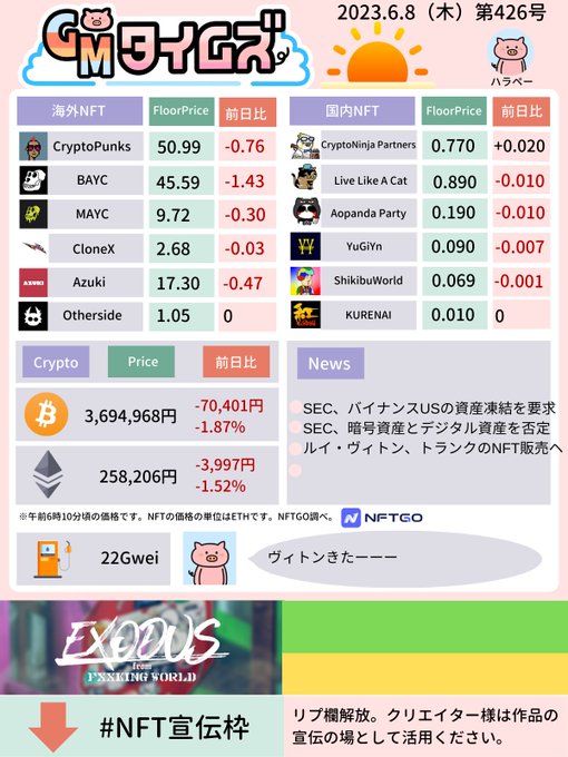 / gmでございます〜☀️ \ GMタイムズ 第426号。今朝のNFTフロアプライス、BTC・ETHの価格、GAS代、Web3ニュースをまとめました。昨日の国内取引量No