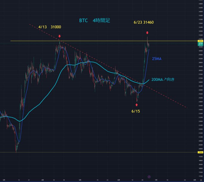 ◇BTC中期チャート(4時間足) 自分もそうですが、短い足ばかり見過ぎると長めの足を見忘れてしまいがちです 1日一回は長い足で確認しましょう 現物派は逆に短い足をあんまり見ないほうが良いのかもしれません 200MA↗、トレンド↗ 今年の天井圏で揉み合い中です…