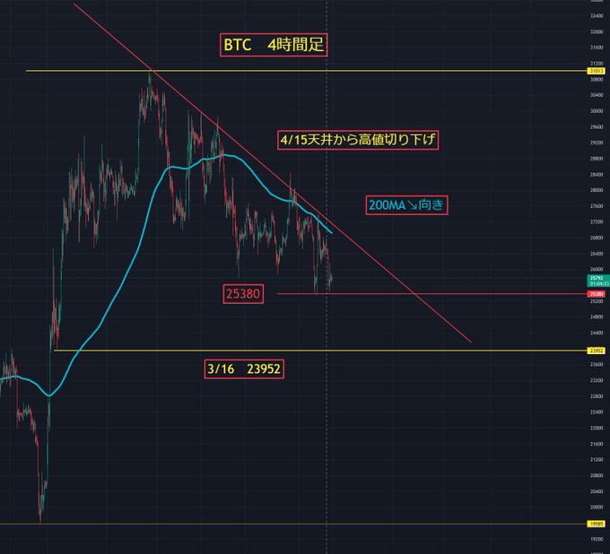 ◇BTC中期チャート チャートはなるべくシンプルにして見る方が分かりやすいです(´・ω・`) 動きがあったわけではないですが、再確認になります 4/15の31000ドルからラインに沿って高値切り下げています 4時間足200MAが下向き↘になっています 下落トレンドが継続しています…
