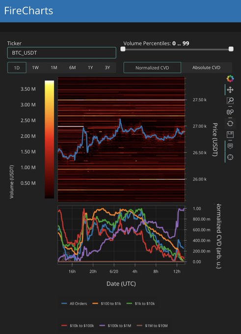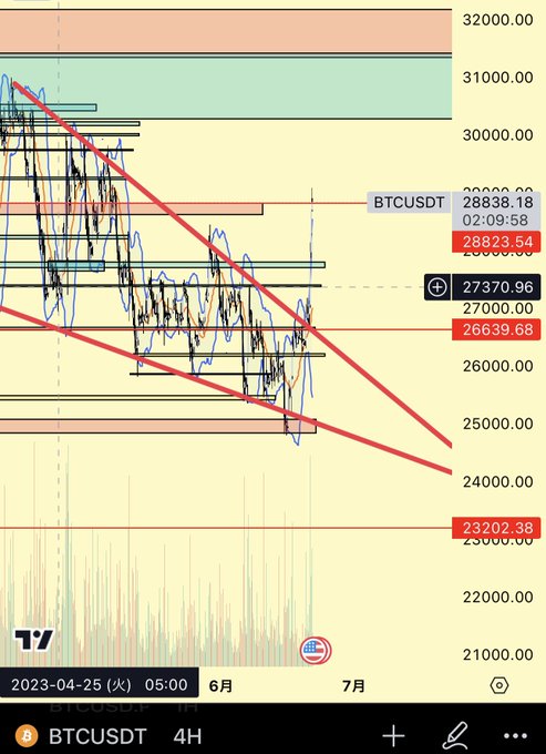$BTC 下降ウェッジをブレイク。27,400ドルの重要レジスタンスをブレイクがショートを焼き払い一気に上昇、 28