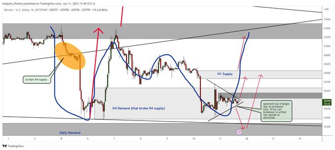 rendy分析 【BTC/USD】ビットコイン/ドル 1時間足 高値切り下げ、均衡三角保ち合い形成。 均衡三角保ち合い形成するとどちらかの方向に大きく動くので直近で動きが出てきそう。 BTCは最近の傾向として三角保ち合い形成すると上に振れる傾向があるので大きな上昇くると見ています。 #BTC