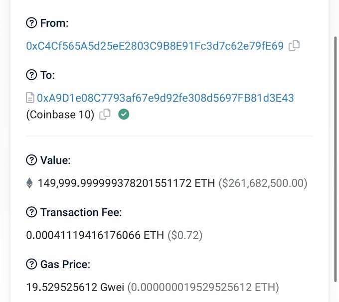 150,000 $ETH ($261.68 million) moved to Coinbase one