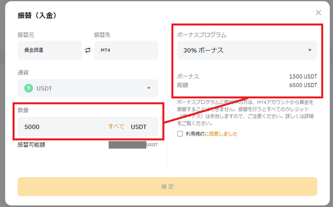 Bybitの口座持ってる人はMT4アカウント作成して口座振替するだけで30%入金ボーナスもらえるからやっておこう! たとえば画像のように5