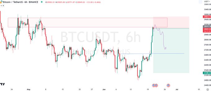 ◇BTC更に上げ幅を拡大して29000手前まで(´・ω・`) 28400のラインにタッチするときに、勢い付けて上がり、落ちると短期天井になりやすいのですが、今回はゆっくりと上がり、下げもゆっくりだったため、28400は抵抗ラインとして弱くスルーになりました 次の抵抗ラインは30000になります(´・ω・`) #BTC…