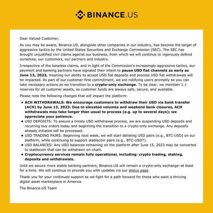 "June 13 - #BinanceUS is going to stop withdrawal of