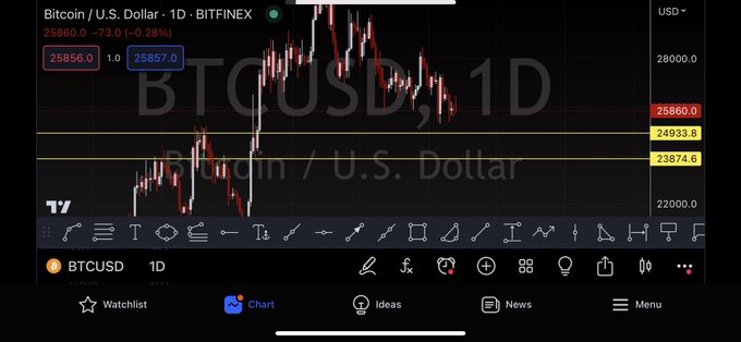 動きがあったので、チャートの現状になります(´・ω・`) BTCは前回の安値25300を抜けるのも時間の問題かもしれません 完全に抜けたら、出来高の少ない真空地帯に突入するため、どこら辺で止まってレンジ形成するかの確認になります ETHは前回安値抜きつつあります…