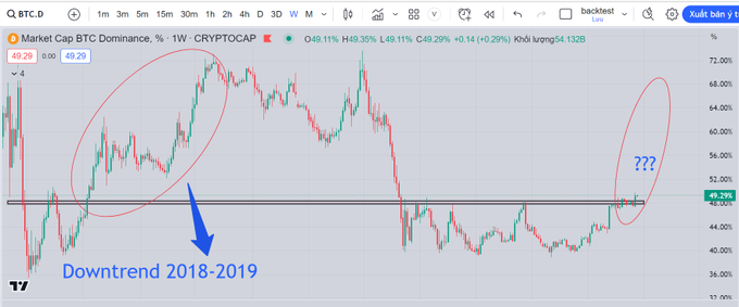 BTC dominance continues to grow, getting close to 50%