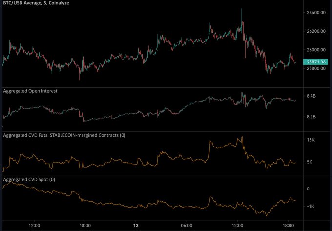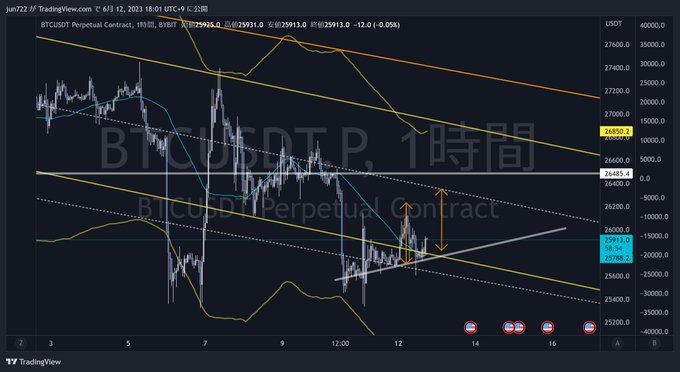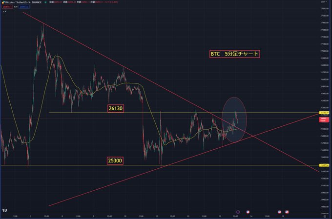 ◇BTC短期チャート(5分足) トレンドラインは抜けましたが、26130のラインは抜けきれませんでした 底値切り上げつつあるので、再チャレンジありそうにも見えますが、21:30のCPI発表まであと8時間切っていること、抜けるかどうかは抜けてから考えれば良いということで、様子見になりました(´・ω・`)…