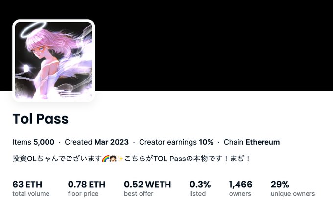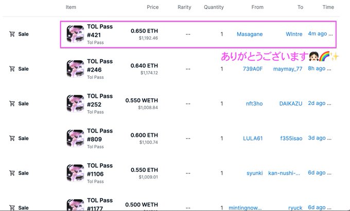 ✅TOL Pass 二次流通で売れてる❤️🔥 ・0.65 ETH(167,000円) お迎えいただいた方、ありがとうございます❤️ (Twitter特定できたけど、鍵アカであることに配慮して、Twitter