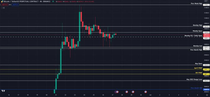 #bitcoin 6.20 别把反弹当反转 1.这几天的上涨一致性比较差,几乎还是BTC的独秀,更多是从31000下跌以来退三进二式的反弹,27300-28600区间是潜在反弹结束区域 2