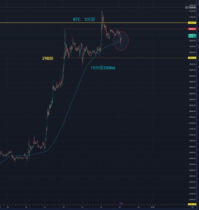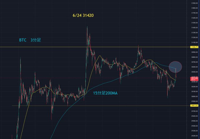 15分足200MAが抵抗線になって、そこから落ちています 短期ショート刈りの動きなので、こういうチャートは弱いかもしれませんね(´・ω・`) このまま続落するかどうか様子見中です #BTC