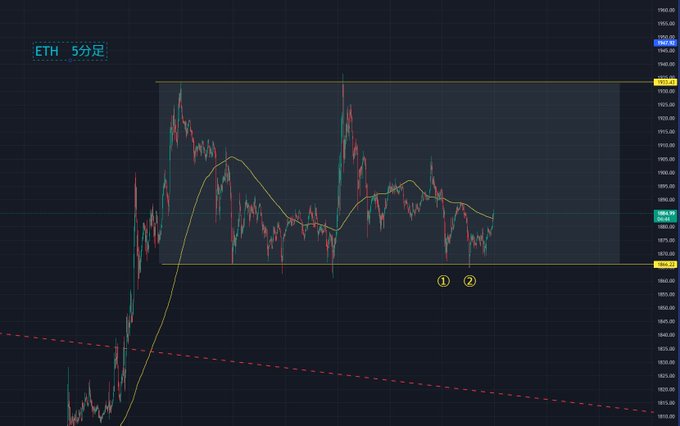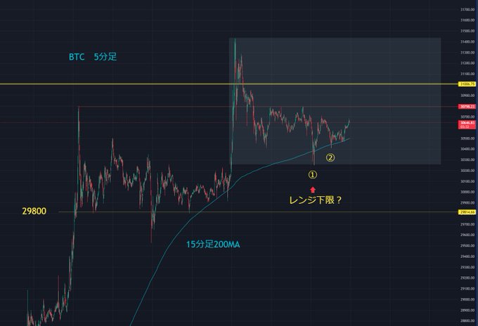 ◇BTC分析(短期) 1時頃に軽めのストップ狩りがありました ストップ狩の時にで出る特徴的な動きです ただ意外と浅めの動きになりました 今のところ15分足200MAサポートは有効になっています BTCは①1時、ETHは②6時頃が安値になっています この辺りが短期レンジ下限になるかもしれません…