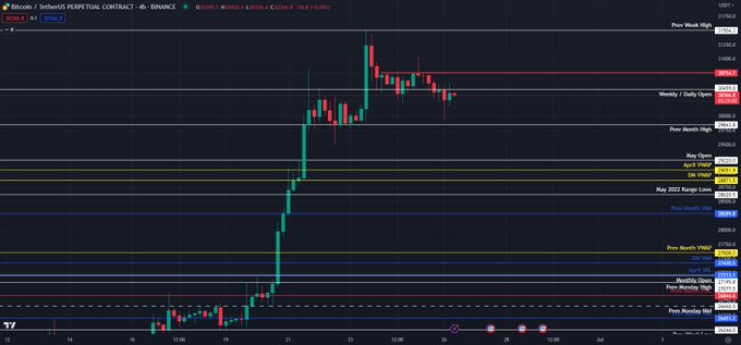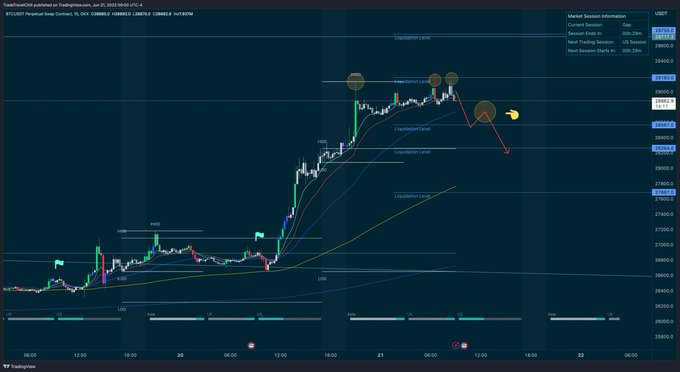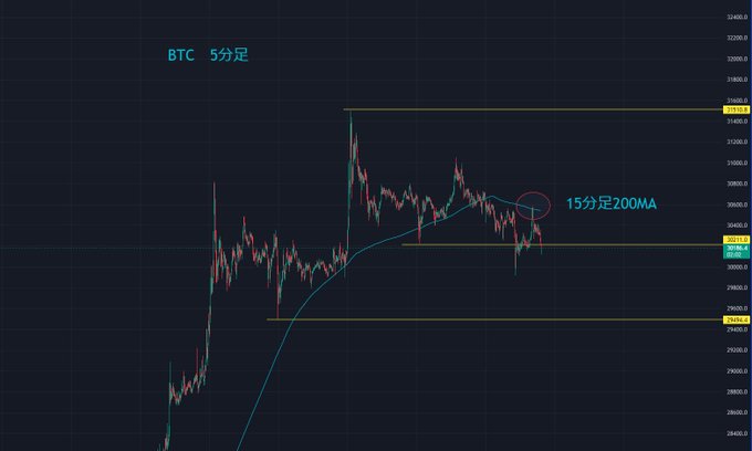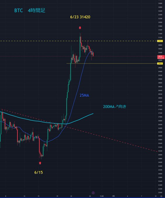 ◇BTC分析(短期) まずは4H足から、レンジ内の動きです 6/23 31420から高値切り下げ 25MAがサポートにならず、逆に抵抗線に 13-17時の陽線を次の足は陰線で包む(進行中) 弱いチャートになりつつあります 5分足チャート 15分足200MAを↘抜けしてから、サポートから抵抗線に…
