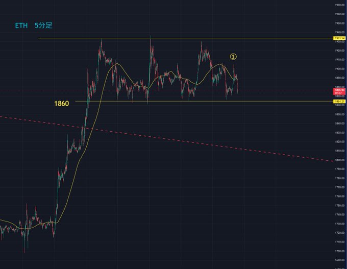 ◇ETHチャート 正直なところ難易度が高いチャートになっています(´・ω・`) 1860のレンジ下限割れ後はレンジ内に戻したのと、BTCが強いため、底抜けをして安値更新はなさそうな感じです 1時間足200MAがサポートとして機能するかもしれません…
