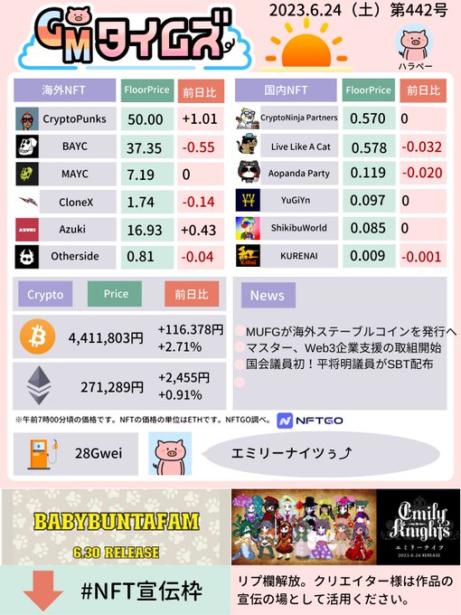/ gmです〜☀️ \ GMタイムズ 第442号。今朝のNFTフロアプライス、BTC・ETHの価格、GAS代、Web3ニュースをまとめました。 #NFT宣伝枠