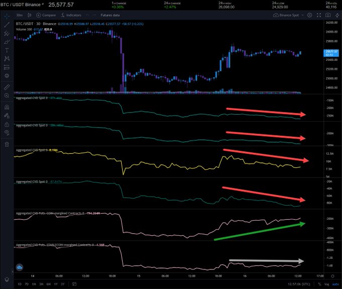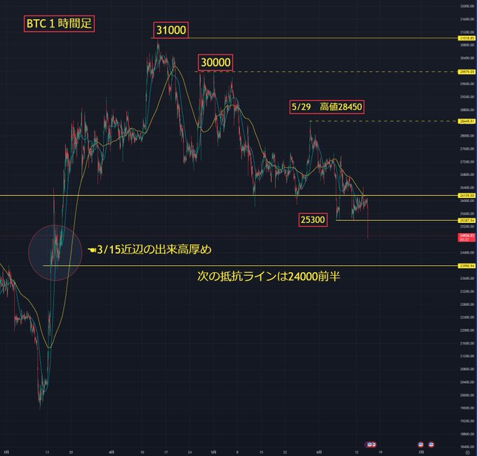 ◇BTCチャート(1時間足) BTCは節目の25000ドルを割りました 次の出来高の厚い抵抗ラインは24000前半付近になります レンジブレイクなので、どこで下げ止まり、レンジ形成をするのか待ちになります #BTC
