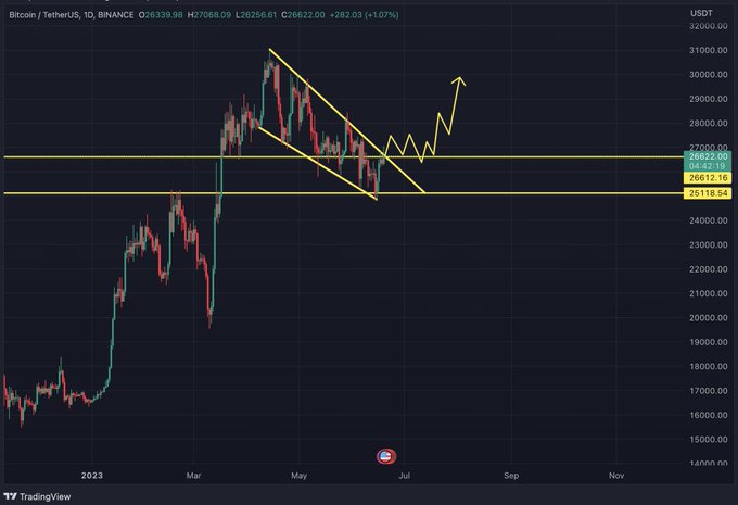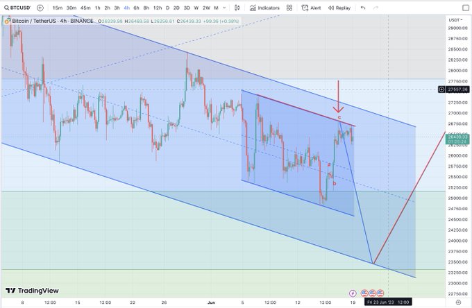 #bitcoin #ETH 6.17 退三进二 1.从31000以来BTC几乎一路都是退三进二,即跌一段后再反弹个2/3,BTC的压力位27000-27500,ETH压力1777-1838 2