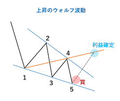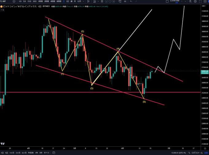 BTC 日足 ワイのなかではチャネルなんだけど、ウェッジって見方もあるようなので・ ウォルフ波動 ⇒ ウォルフ波動だと急峻すぎるw (1) ⇒ (4) で結んだ先が利確目標 それよりも(5)がフェイラーした! こっちが大事やと思うぬぅ チャネルの上限・下限に届かないで反転は、転換点!
