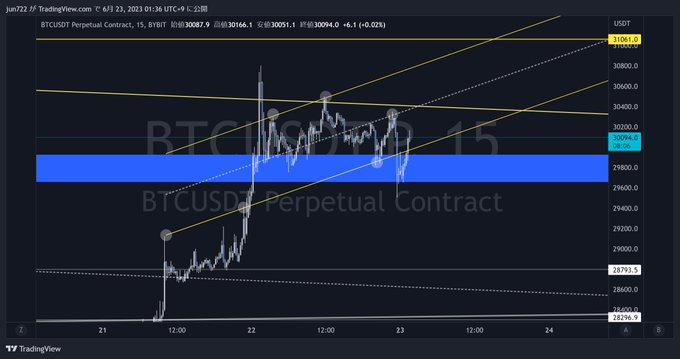 ◇BTC短期チャート 三角保ち合い↗抜けからの失速チャートになりました 15分足200MAはサポートとして機能しなくなりました トレンドライン上ですが、一回抜けて戻ってきた場合は機能しないと見ています 今はレンジ範囲内の動きとなっています…